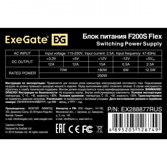 Блок питания 200W ExeGate F200S (Flex ATX, for ITX case, 4cm fan, 24pin, (4+4)pin, 3xSATA, 2xIDE)