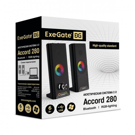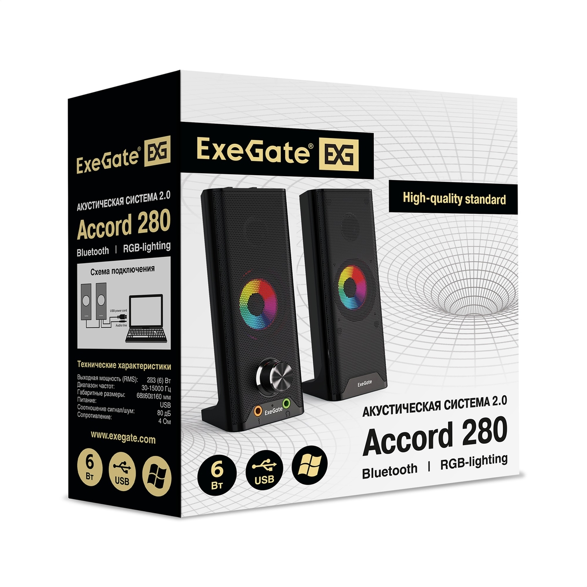 Саундбар-Акустическая система 2.0 ExeGate Accord 280 (питание USB, Bluetooth, 2х3Вт (6Вт RMS), 60-20000Гц, цвет черный, RGB подсветка, с возможностью трансформации в саундбар, Color Box)