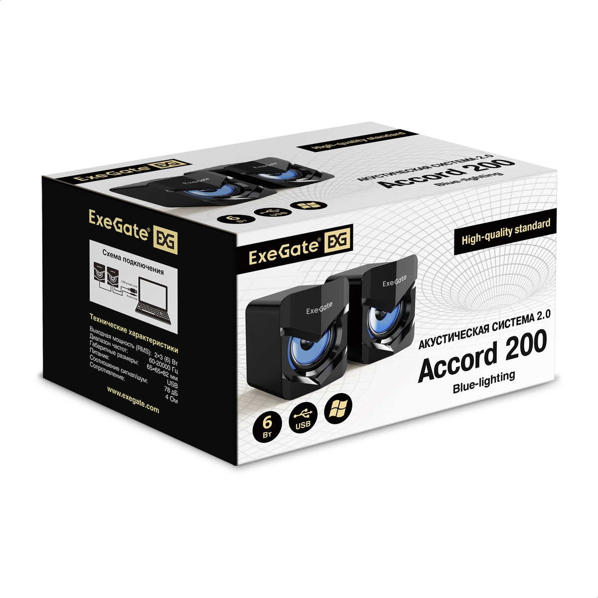 Акустическая система 2.0 ExeGate Accord 200 (питание USB, 2х3Вт (6Вт RMS), 60-20000Гц,цвет черный, синяя подсветка, Color Box)