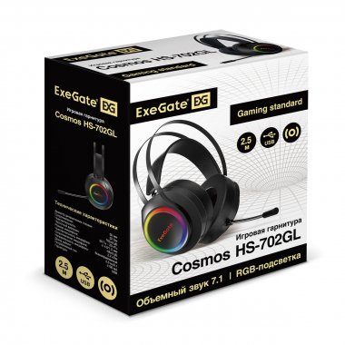 Полноразмерные игровые наушники с микрофоном (гарнитура) ExeGate Cosmos HS-702GL (регулировка оголовья, гибкий дежатель микрофона, объемный звук 7.1, длина кабеля 2.5м, динамик 50мм, 20-20000Гц, RGB подсветка, USB интерфейс, регулировка громкости, Color Box)