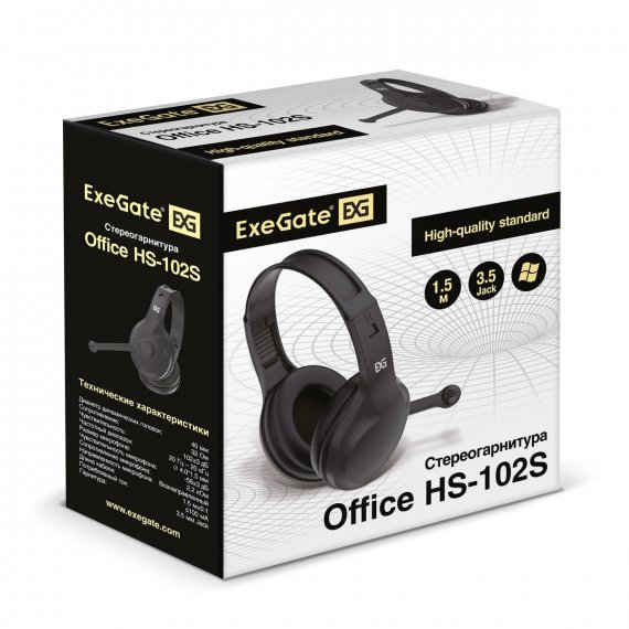 Полноразмерные наушники с микрофоном (гарнитура) ExeGate Office HS-102S (регулировка оголовья, 4-контактный 3.5 мм мини-джек, динамик 40мм, 20-20000Гц, длина кабеля 1,5м, регулировка громкости на кабеле, Color Box)