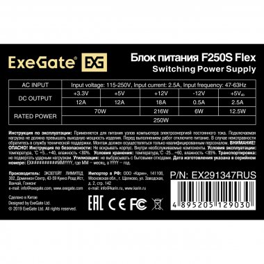 Блок питания 250W ExeGate F250S (Flex ATX, for ITX case, 4cm fan, 24pin, (4+4)pin, 3xSATA, 2xIDE)
