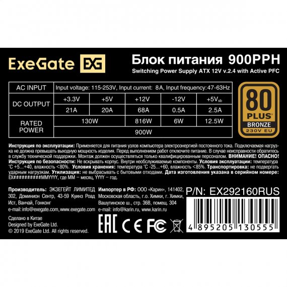 Блок питания 900W ExeGate 80 PLUS® Bronze 900PPH (ATX, APFC, КПД 89% (80 PLUS Bronze), 12cm fan, 24pin, 2x(4+4)pin, 4xPCI-E, 8xSATA, 4xIDE, black, Color box)