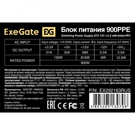 Блок питания 900W ExeGate 900PPE (ATX, APFC, SC, КПД 80% (80 PLUS), 12cm fan, 24pin, 2x(4+4)pin, 6xPCI-E, 6xSATA, 4xIDE, black, кабель 220V 1,8м с защитой от выдергивания)