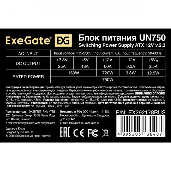 Блок питания 750W ExeGate UN750 (ATX, SC, 12cm fan, 24pin, 2x(4+4)pin, 2xPCI-E, 5xSATA, 3xIDE, кабель 220V 1,8м с защитой от выдергивания)