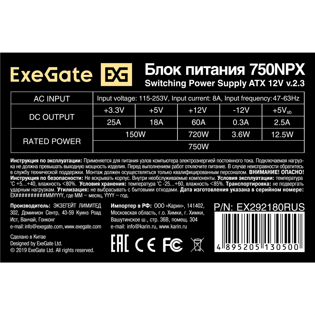 Блок питания 750W ExeGate 750NPX (ATX, SC, 12cm fan, 24pin, 2x(4+4)pin, 2xPCI-E, 5xSATA, 3xIDE, black, кабель 220V 1,8м с защитой от выдергивания)