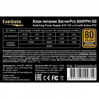 Exegate EX292204RUS Серверный БП 600W ServerPRO 80 PLUS® Bronze 600PPH-SE