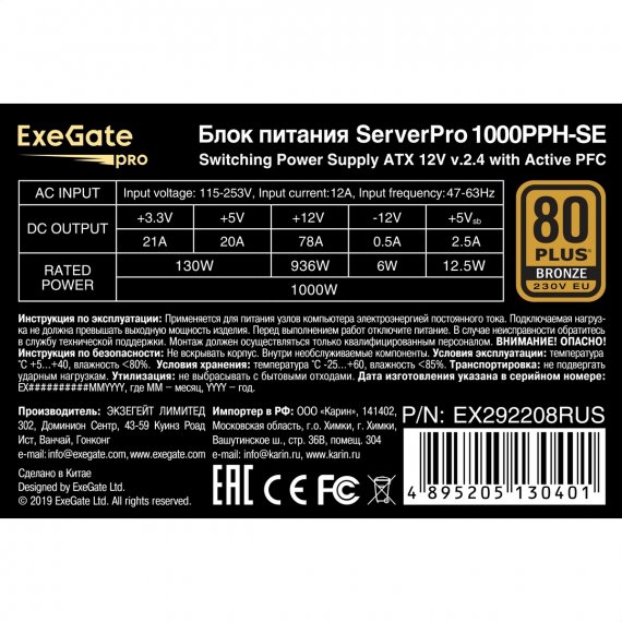 Exegate EX292208RUS Серверный БП 1000W ServerPRO 80 PLUS® Bronze 1000PPH-SE