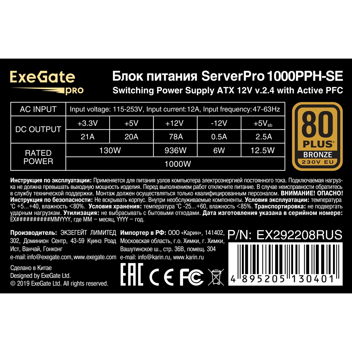 Серверный БП 1000W ExeGate ServerPRO 80 PLUS® Bronze 1000PPH-SE (ATX, APFC, КПД 89% (80 PLUS Bronze), 12cm fan, 24pin, 2x(4+4)pin, 6xPCI-E, 8xSATA, 4xIDE, black, RTL)