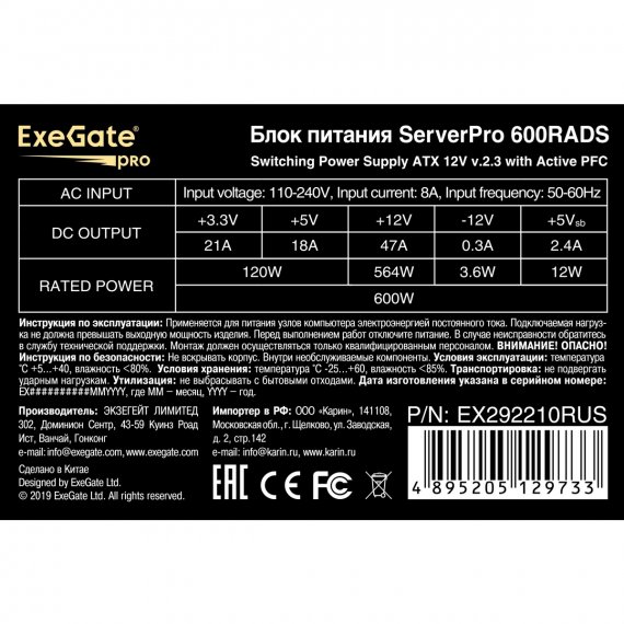 Exegate EX292210RUS Серверный БП 600W ServerPRO-600RADS