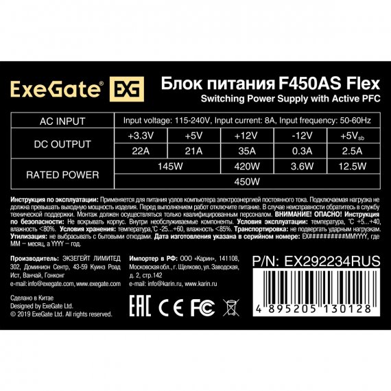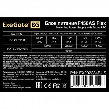 Блок питания 450W ExeGate F450AS (Flex ATX, for ITX case, APFC, КПД 80% (80 PLUS), 4cm fan, 24pin, (4+4)pin, PCI-E, 3xSATA, 2xIDE)