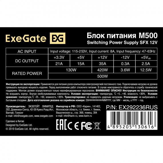Блок питания 500W ExeGate M500 (SFX, APFC, КПД 87% (80 PLUS Silver), 8cm fan, 24pin, (4+4)pin, 2xPCI-E, 3xSATA, 2xIDE, black)