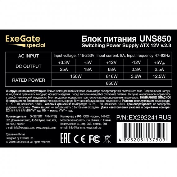 Блок питания 850W ExeGate UNS850 (ATX, 12cm fan, 24pin, 2x(4+4)pin, 2xPCI-E, 5xSATA, 3xIDE)