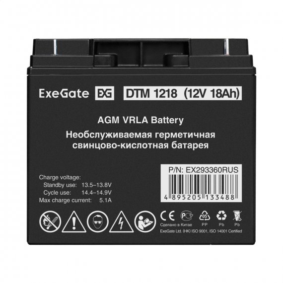 Exegate EX293360RUS Аккумуляторная батарея DTM 1218 (12V 18Ah, клеммы F3 (под болт М5 с гайкой))