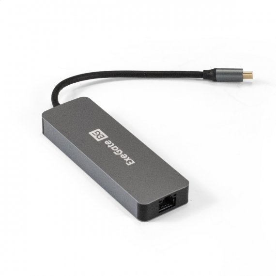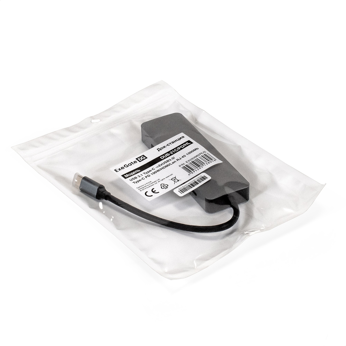 Док-станция 5-в-1 ExeGate DUB-21C/PD/HL (кабель-адаптер USB Type-C --> 2xUSB3.0 + PD 100W + HDMI 4K@60Hz + Lan RJ45 10/100/1000Mb, Plug&Play, корпус алюминиевый, цвет серый)