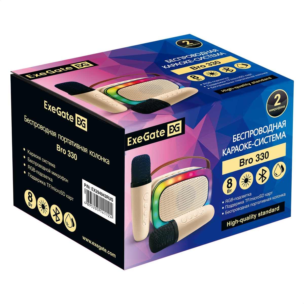 Караоке-система ExeGate Bro 330 (BT-колонка с двумя беспроводными микрофонами и RGB подсветкой, 8Вт, 80-15000Гц, Bluetooth, Li-Ion, 1200mAh, с поддержкой USB и TF/microSD карт, 3,5mm audio jack, зарядка USB Type-C, Color Box)