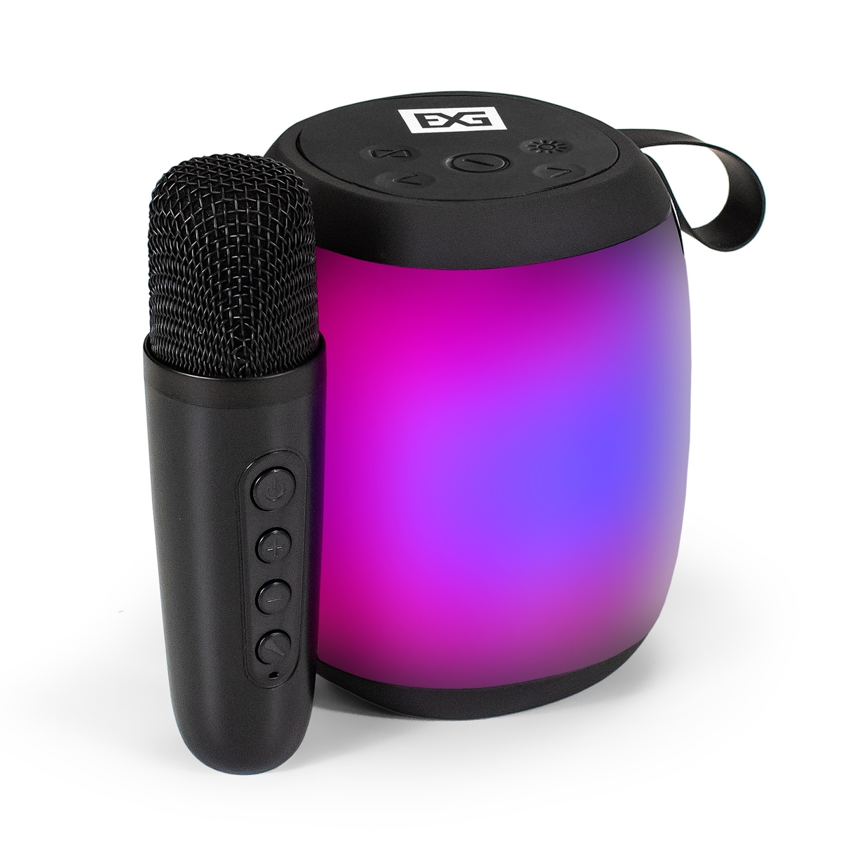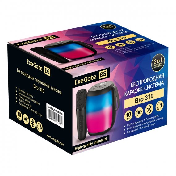 Караоке-система ExeGate Bro 310 (BT-колонка с беспроводным микрофоном и RGB подсветкой, 10Вт, 80-15000Гц, Bluetooth, Li-Ion, 1200mAh, FM 87.5MHz-108MHz, с поддержкой USB и TF/microSD карт, 3,5mm audio jack, зарядка USB Type-C, Color Box)