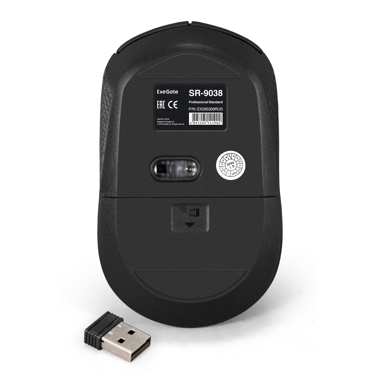 Беспроводная мышь ExeGate Professional Standard SR-9038 (радиоканал 2,4 ГГц, USB, оптическая, 1200dpi, 3D, 3 кнопки и колесо прокрутки, черная, Color Box)