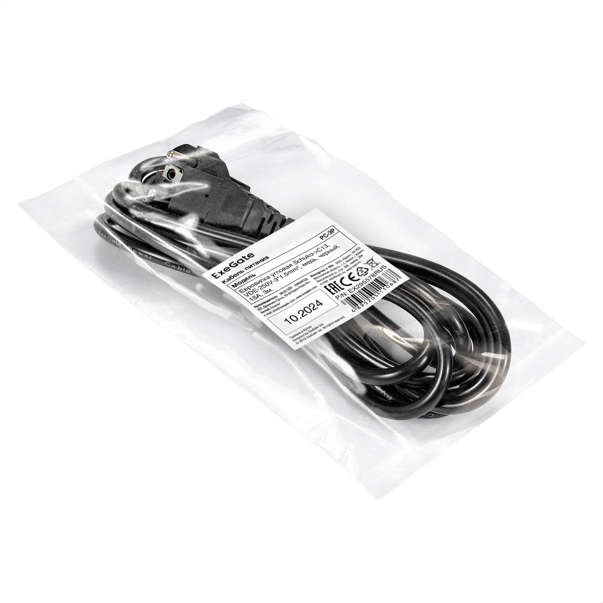 Кабель питания ExeGate Power PC-3P-Schuko(У)->C13/3x1.5Cu (Евровилка угловая Schuko->C13, VDE-250V-3*1.5mm2, медь, черный, 10A, 3м)
