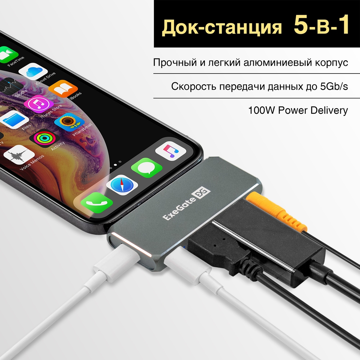 Док-станция 5-в-1 ExeGate DUB-31C/PD/HA (адаптер USB Type-C --> 1xUSB3.0 (5Gb/s) + Type-C DATA (5Gb/s) + PD 100W + HDMI 4K@30Hz + Audio, Plug&Play, подходит для iPad Pro и мобильных телефонов, корпус алюминиевый, серый)