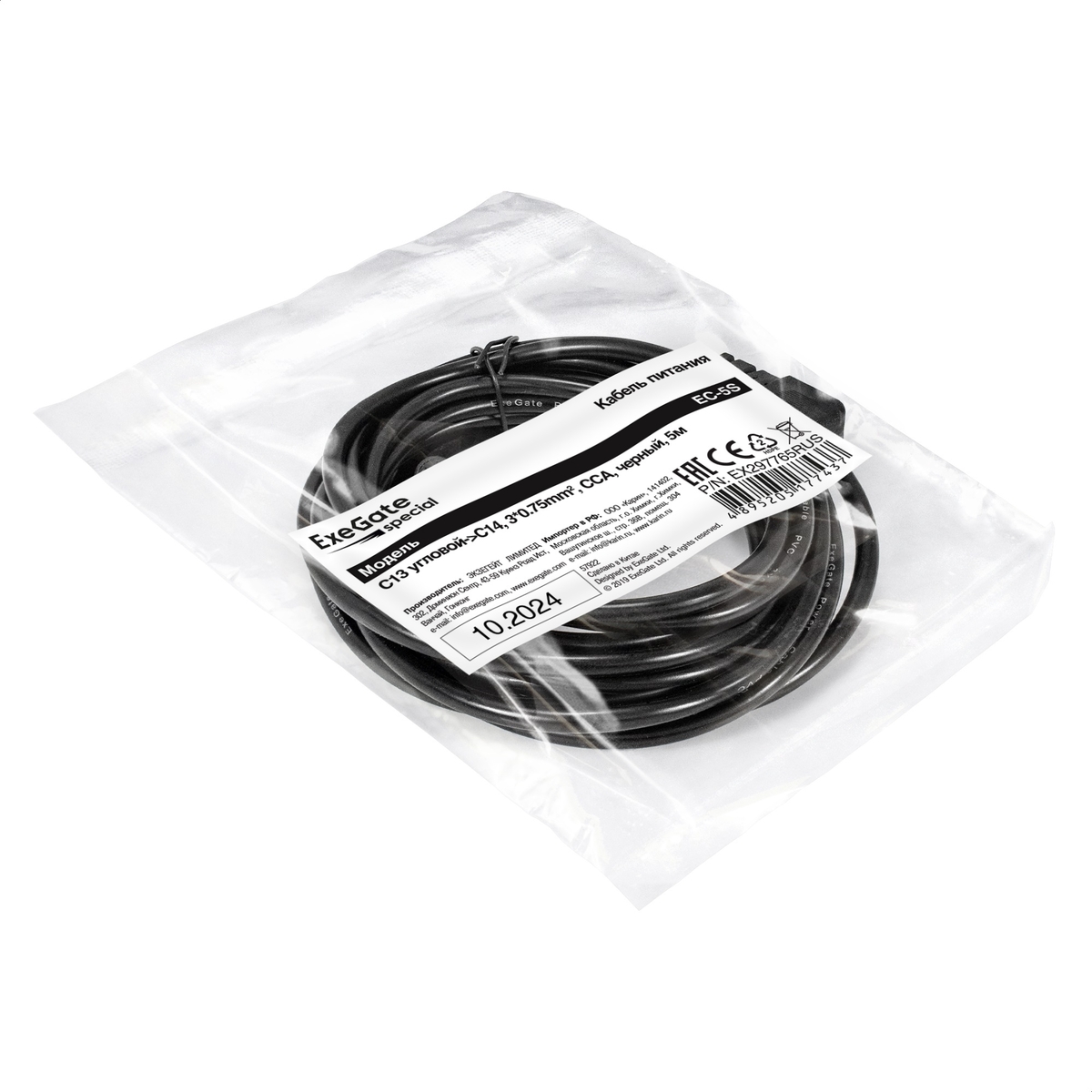 Кабель питания ExeGate Special EC-5S-C13(У)->C14/3x0.75 (C13 угловой->C14, 3*0.75mm2, CCA, черный, 5м)