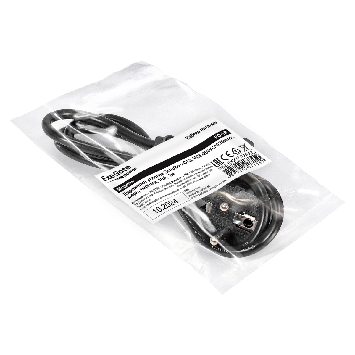 Кабель питания ExeGate Power PC-1P-Schuko(У)->C13/3x0.75Cu (Евровилка угловая Schuko->C13, VDE-250V-3*0.75mm2, медь, черный, 10A, 1м)