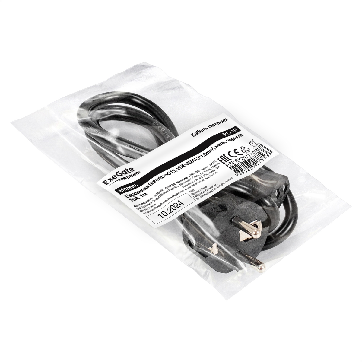 Кабель питания ExeGate Power PC-1P-Schuko->C13/3x1.0Cu (Евровилка Schuko->C13, VDE-250V-3*1.0mm2, медь, черный, 10A, 1м)