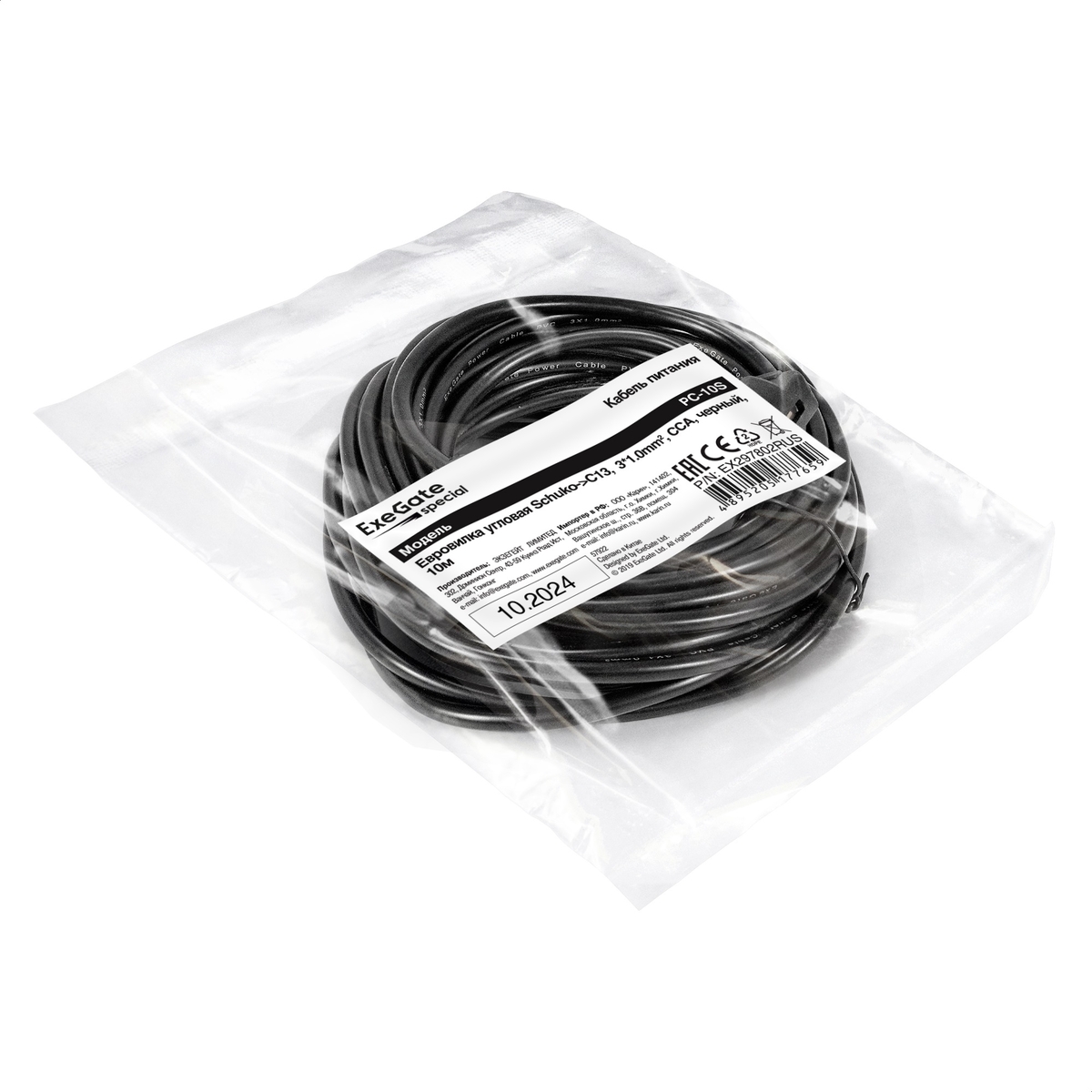 Кабель питания ExeGate Special PC-10S-Schuko(У)->C13/3x1.0 (Евровилка угловая Schuko->C13, 3*1.0mm2, CCA, черный, 10м)