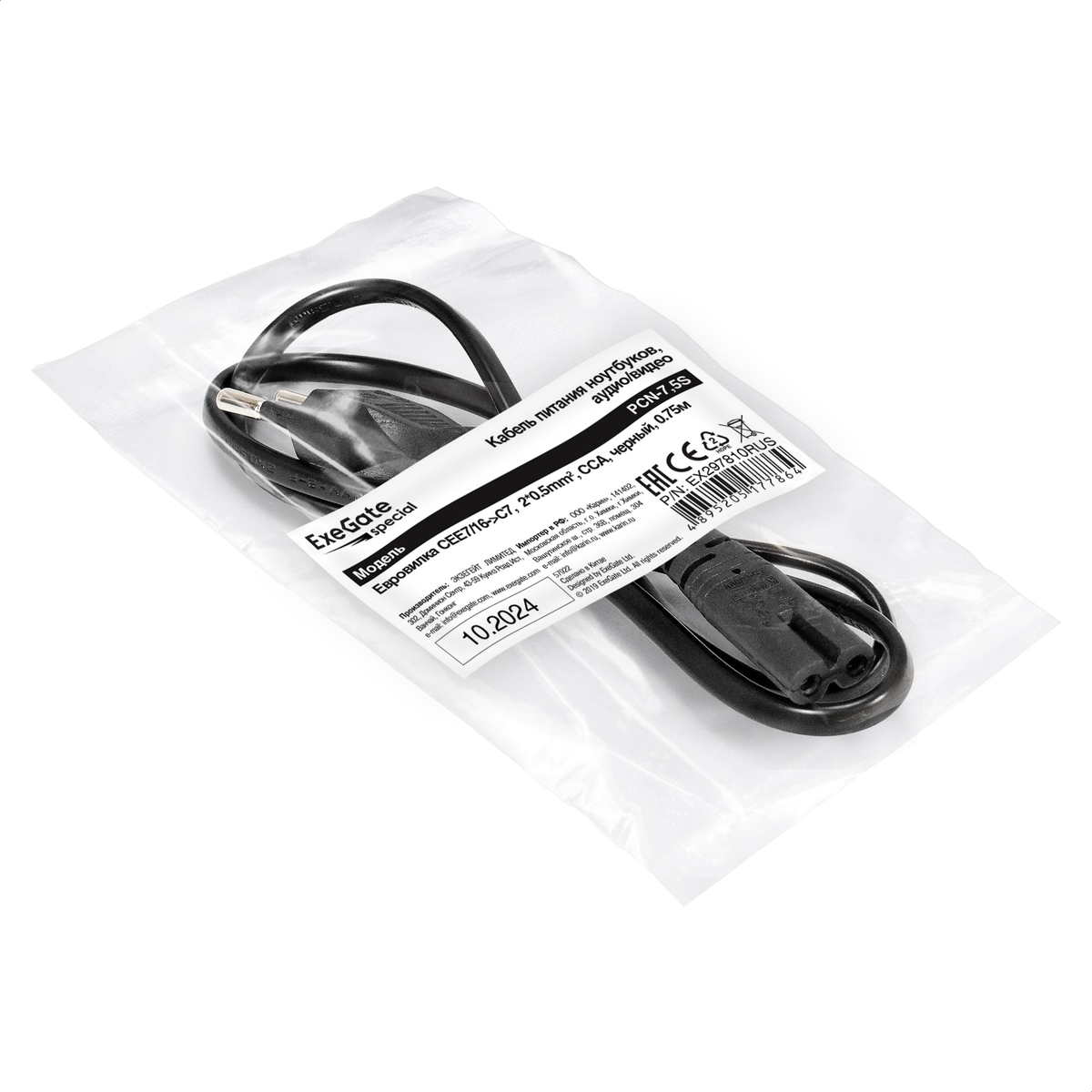 Кабель питания ноутбуков, аудио/видео ExeGate Special PCN-0.75S-EU->C7/2x0.5 (Евровилка CEE7/16->C7, 2*0.5mm2, CCA, черный, 0.75м)