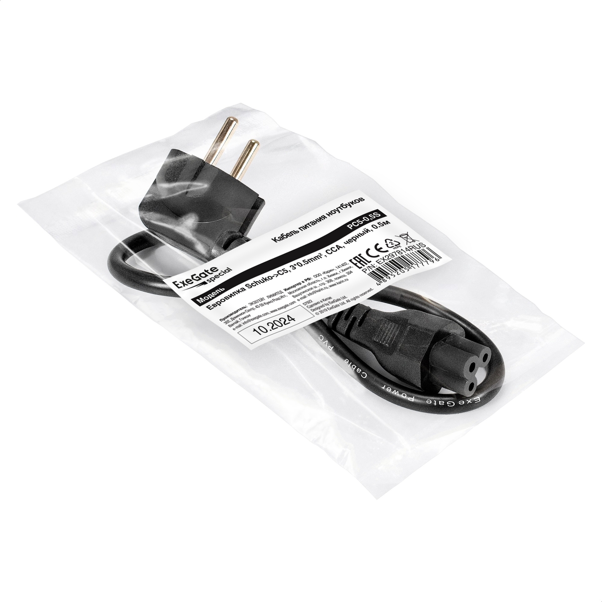 Кабель питания ноутбуков ExeGate Special PC5-0.5S-Schuko->C5/3x0.5 (Евровилка Schuko->C5, 3*0.5mm2, CCA, черный, 0.5м)