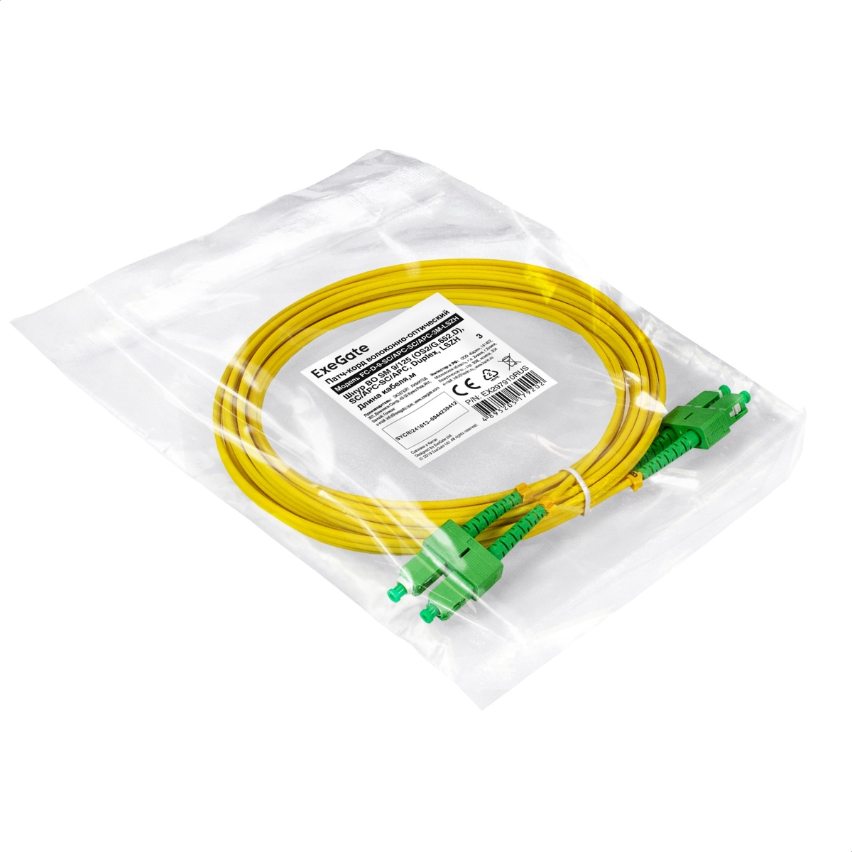 Патч-корд волоконно-оптический ExeGate FC-D-9-SC/APC-SC/APC-3M-LSZH (Шнур ВО SM 9/125 (OS2/G.652.D), SC/APC-SC/APC, Duplex, LSZH, 3м)