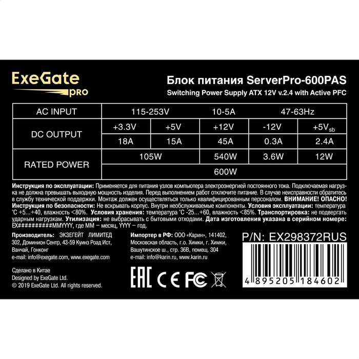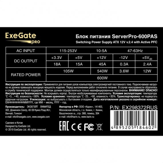 Exegate EX298372RUS Серверный БП 600W ServerPRO-600PAS