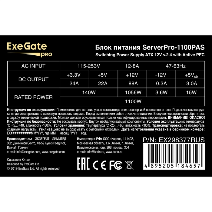 Exegate EX298377RUS Серверный БП 1100W ServerPRO-1100PAS
