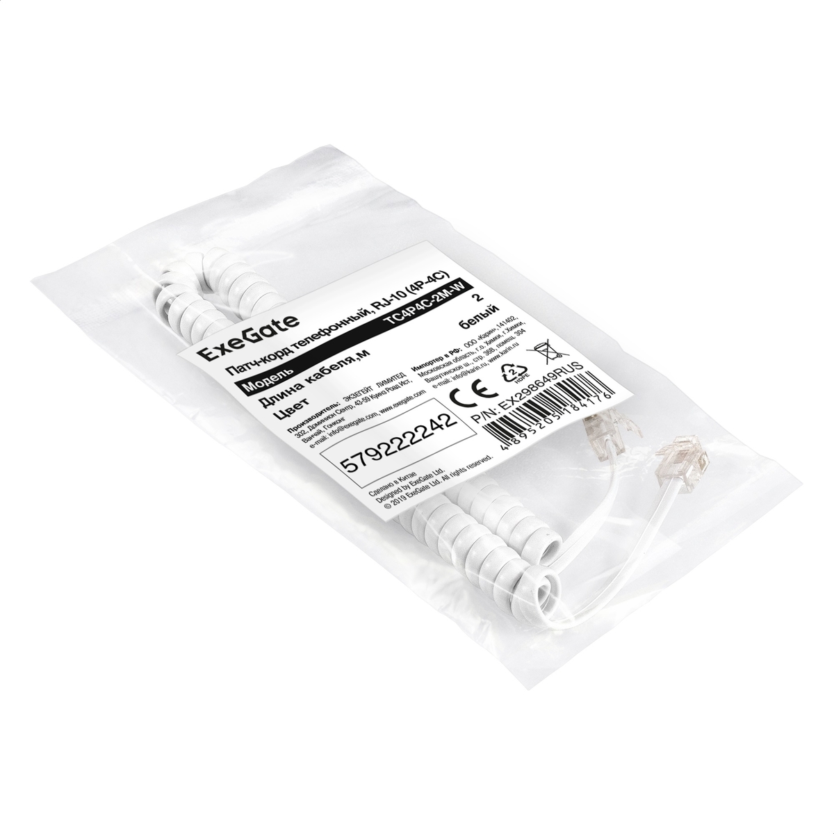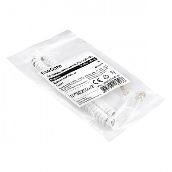 Шнур (патч-корд) телефонный ExeGate TC4P4C-2M-W (витой, RJ-10 (4P-4C), 2м, белый)