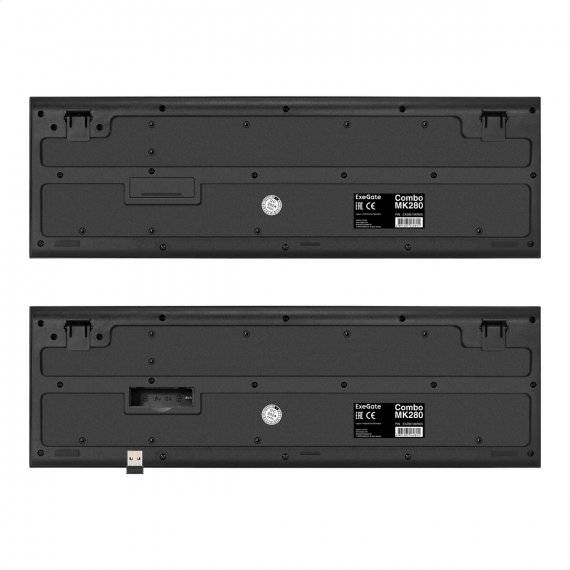 Комплект беспроводной ExeGate Professional Standard Combo MK200 (клавиатура полноразмерная влагозащищенная 104кл. + мышь оптическая 1200dpi, 3 кнопки и колесо прокрутки; USB, радиоканал 2,4 ГГц, радиус действия до 10м, черный, RTL)