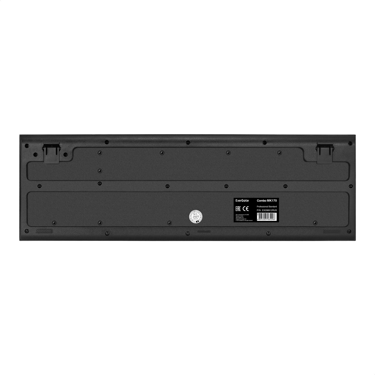 Комплект ExeGate Professional Standard Combo MK170 (клавиатура влагозащищенная 104кл., длина кабеля 1,5м + мышь оптическая 1200dpi, 3 кнопки и колесо прокрутки, длина кабеля 1,2м; USB, черный, RTL)