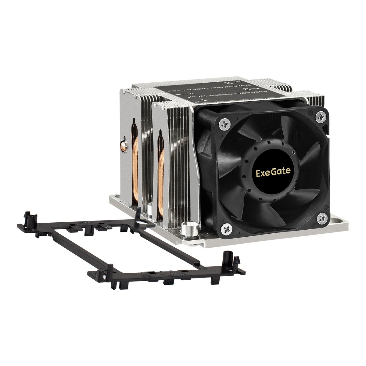Кулер+направляющая планка ExeGate ESNK-P0068AP4.PWM.2U.3647.Cu + BKT-0126 (Al+Cu, 2U, 4 тепл. трубки, LGA3647, Square, TDP 205W, PWM, 2100-6800RPM, 2 ball bearing, 4pin, 52db, 430г, на винтах, с термопастой, в комплекте с направляющей планкой (back plate BKT-0126), RTL)