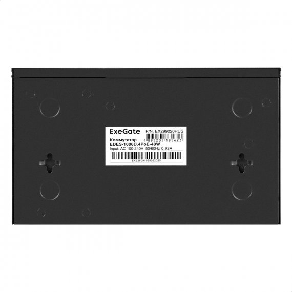Коммутатор неуправляемый ExeGate EDES-1006D.4PoE-48W (6-портовый UTP 10/100 Base-Tx: 4 порта 802.3af (PoE), мощность PoE: 25W, суммарно 48W, 2 порта RJ45 uplink, настенный/настольный, металлический корпус)