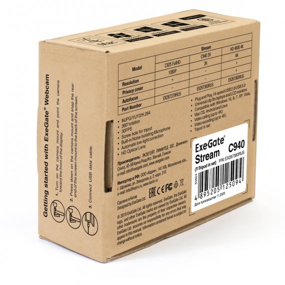 Веб-камера ExeGate Stream C940 2K поддерживает разрешение 2K, передачу данных по стандарту H.264, имеет ручной фокус.